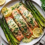 The salmon turns out juicy, the asparagus tender, and the lemon garlic sauce ties everything together in perfect harmony. It looks like something from a restaurant, but it’s easy enough for a Tuesday night.