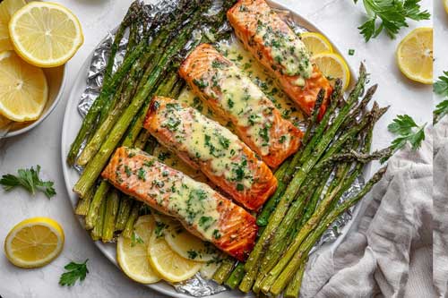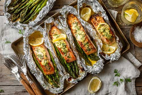 • Keywords: baked salmon in foil, salmon foil packets, lemon garlic salmon, healthy salmon dinner, easy salmon recipe, baked salmon and asparagus