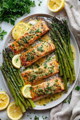 The result? Perfectly tender salmon, crisp-tender asparagus, and that golden buttery lemon sauce that tastes like sunshine.