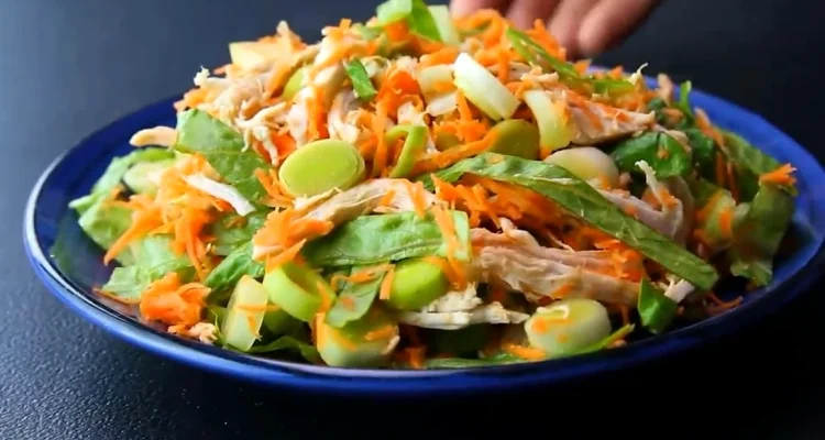 This chicken lettuce salad keeps things light but still filling with poached chicken, crisp lettuce, carrot, green onion, and a quick sweet soy dressing.