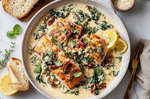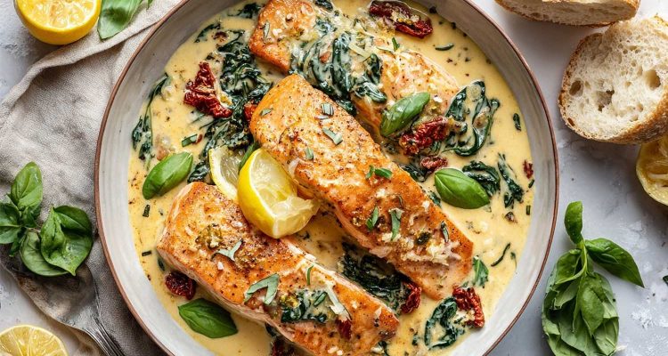 Have you ever made salmon and thought there has to be a better way than boring baked fish? This Creamy Tuscan Salmon recipe is that answer, it’s restaurant-quality, rich sauce, pan-seared salmon, and done in about 30 minutes. 🍽️
