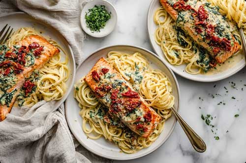 What it is: Pan-seared salmon cooked in a rich, creamy Tuscan sauce with sun-dried tomatoes and spinach.