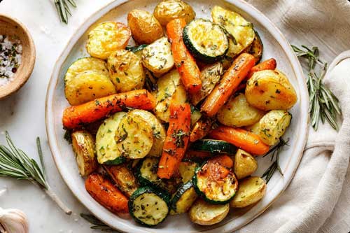 Your garlic herb roasted potatoes, carrots, and zucchini are now ready to serve, hot, colorful, and full of flavor.