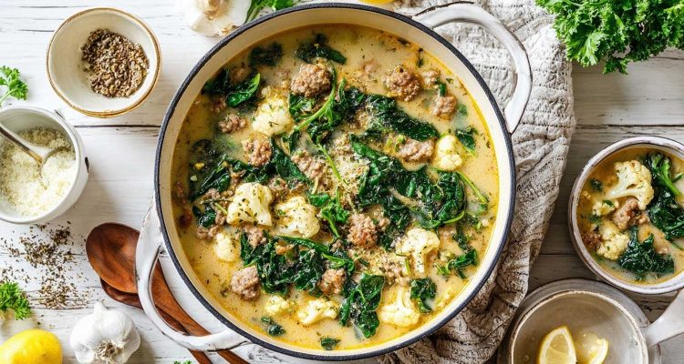 Traditional Zuppa Toscana uses potatoes for heartiness. Here, cauliflower steps in to do the same job — without the carbs.