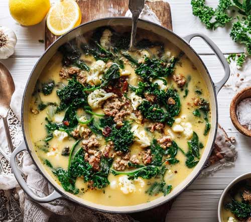 Yes! Brown the bacon and sausage in a large pot, then add the onions, garlic, broth, and cauliflower. Simmer for 15 minutes or until cauliflower is tender. Stir in the cream, kale, and Parmesan, and simmer another 5 minutes.