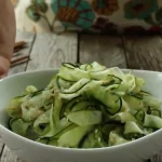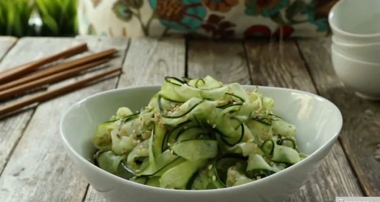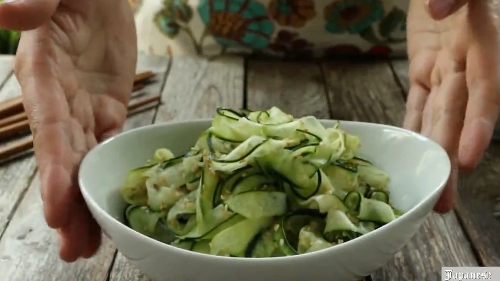 This Japanese cucumber salad turns one cucumber into a cool ribboned side with rice vinegar, sugar, salt, and sesame seeds.