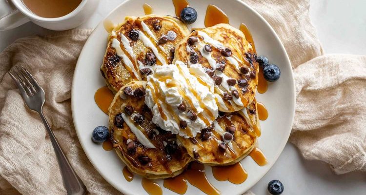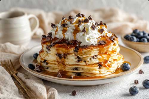 These pancakes have that soft, melt-in-your-mouth feel with crisp edges if you cook them long enough. The chocolate chips melt slightly, giving you that bittersweet touch that balances perfectly with the buttery syrup.