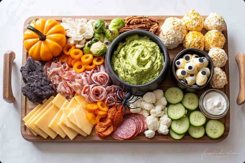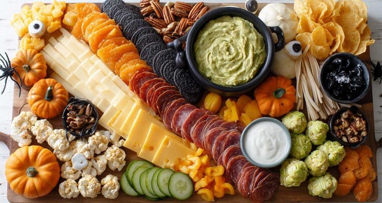 It’s a full spread of cheeses, cured meats, crunchy veggies, nuts, and a few clever sauces, styled with little Halloween props that make guests grin.