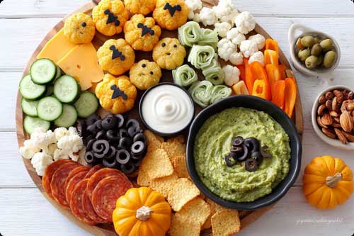 Think bat-shaped salami, mozzarella “eyeballs,” cheddar “pumpkins,” and a creamy dip that looks like a mini cauldron.