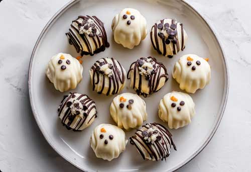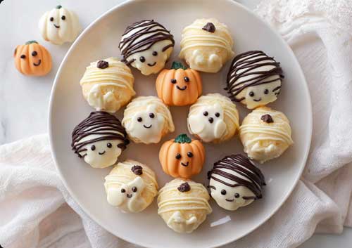- Ghosts: Use white chocolate, then draw faces with melted dark chocolate or food-safe markers.