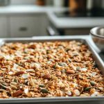 Spread the mixture in an even layer on your prepared baking sheet. Bake for 15–20 minutes, stirring halfway through to ensure even toasting. Keep an eye on the granola, as it can burn quickly.