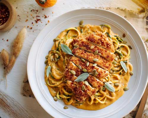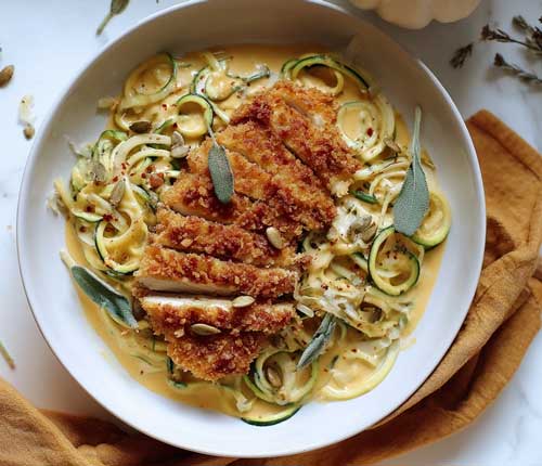 PrintKeto Pumpkin Alfredo Zoodles with Crispy Chicken Recipe
