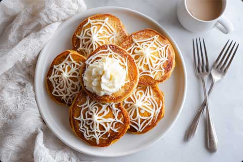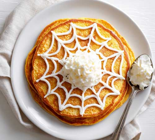 Stack pancakes on a plate. Pipe cream cheese webs on top.