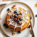 You’re making a stack of fluffy almond flour pancakes, gently spiced with pumpkin pie vibes, cooked in butter until golden. Then, you’re gonna drizzle or pipe little cream cheese “webs” on top. If it’s Halloween, you can even drop a few blueberries in the middle like spiders. But even if it’s April and you’ve just got leftover canned pumpkin? This still works.
