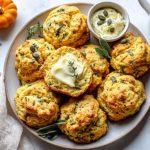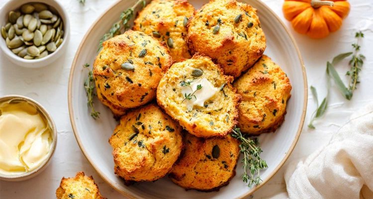 They’re soft inside, a tiny bit crisp at the edges, and they taste like someone hugged sage and thyme then whispered “butter.” No rolling, no biscuit cutter, no stress. Just mix, scoop, bake, boom, tray of orange-gold biscuits that feel right at home next to soup, chili, or a roast pan full of chicken.