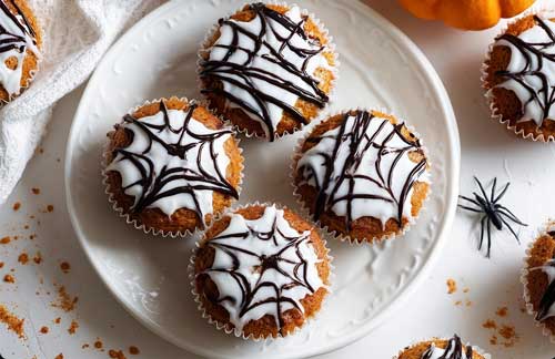 For minis, bake 10–12 minutes and pipe tiny webs.