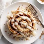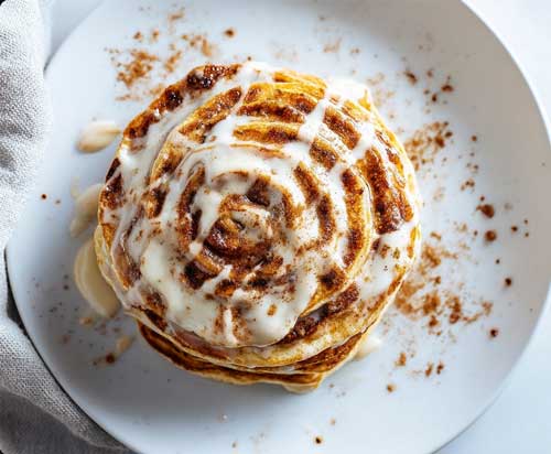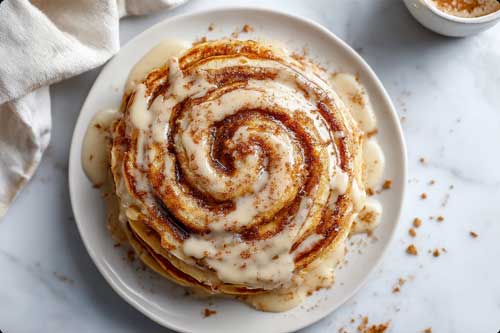 Once the pancakes are ready, drizzle that glaze over the stack and watch it melt into every cinnamon swirl.