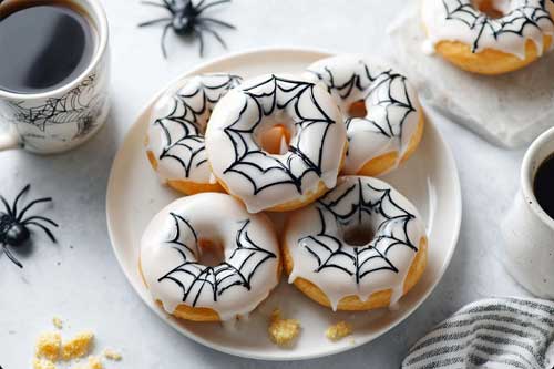 Soft, golden keto vanilla doughnuts with a spooky spiderweb icing made from sugar-free sweetener. These Halloween treats are easy to bake, low in carbs, and taste just like a bakery favorite without any sugar.