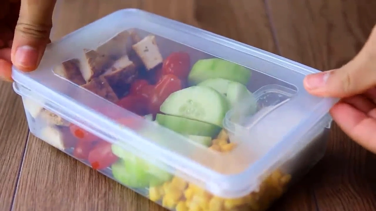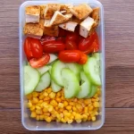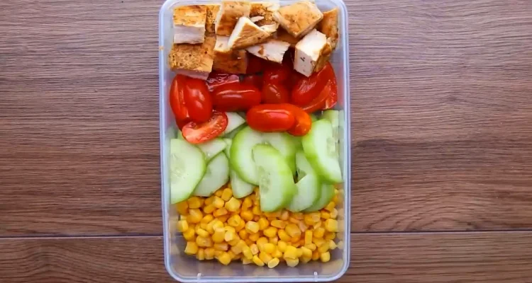 5. Add the corn, cucumber, and tomatoes to a lunch box.