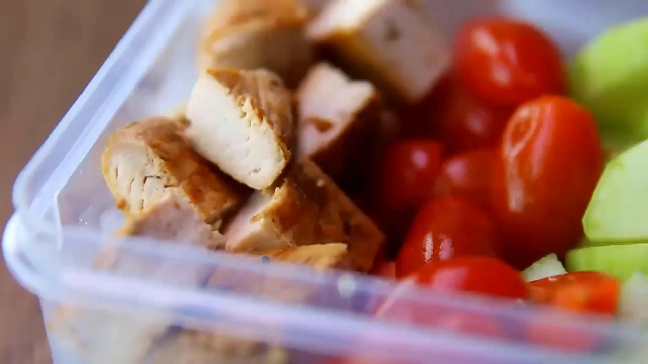 Corn, cucumber, tomatoes, and chicken being added to a meal prep container