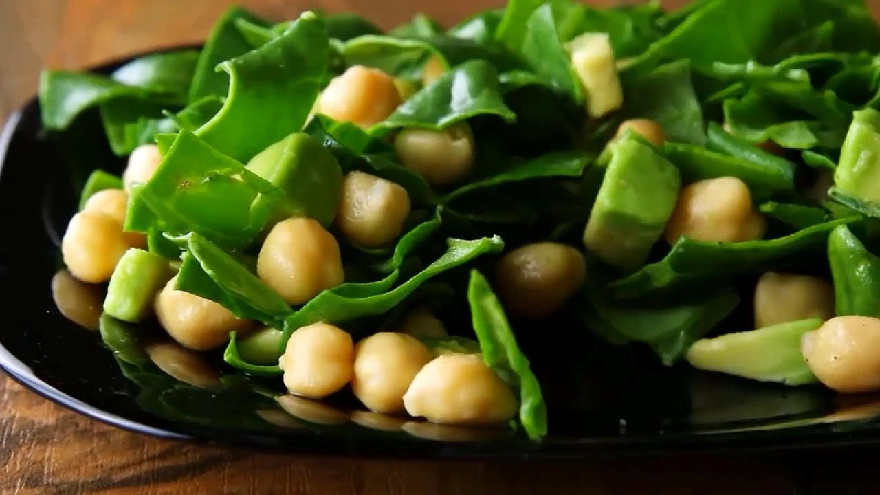 - Pour in the lemon juice right over the greens and chickpeas.Drizzle the olive oil across the bowl and finish with salt and black pepper.