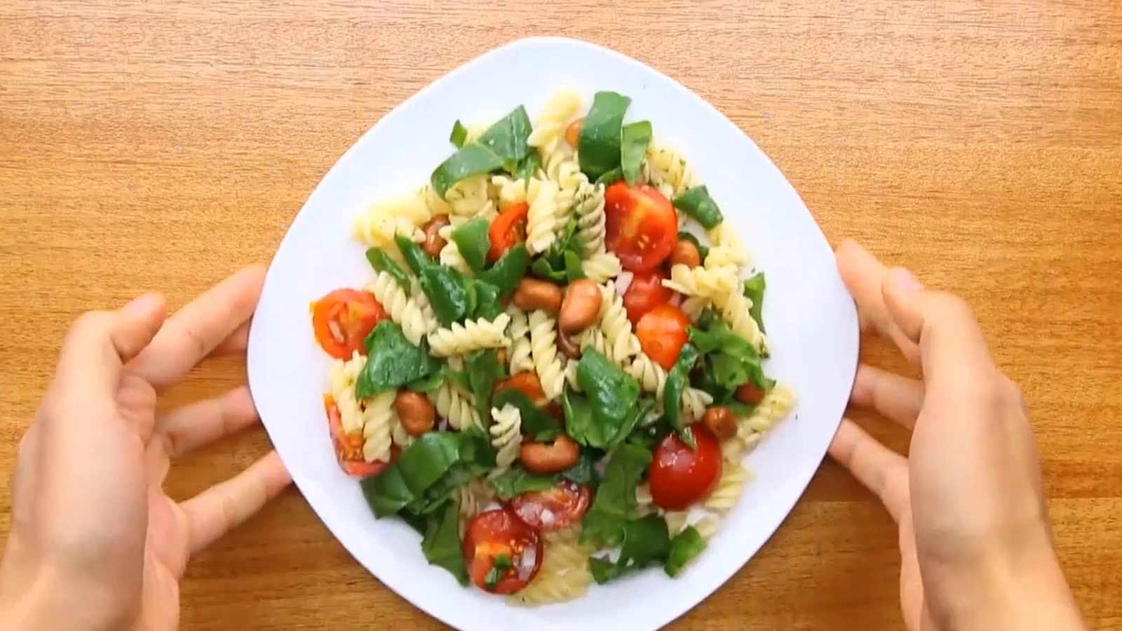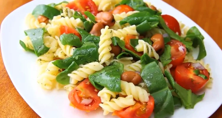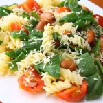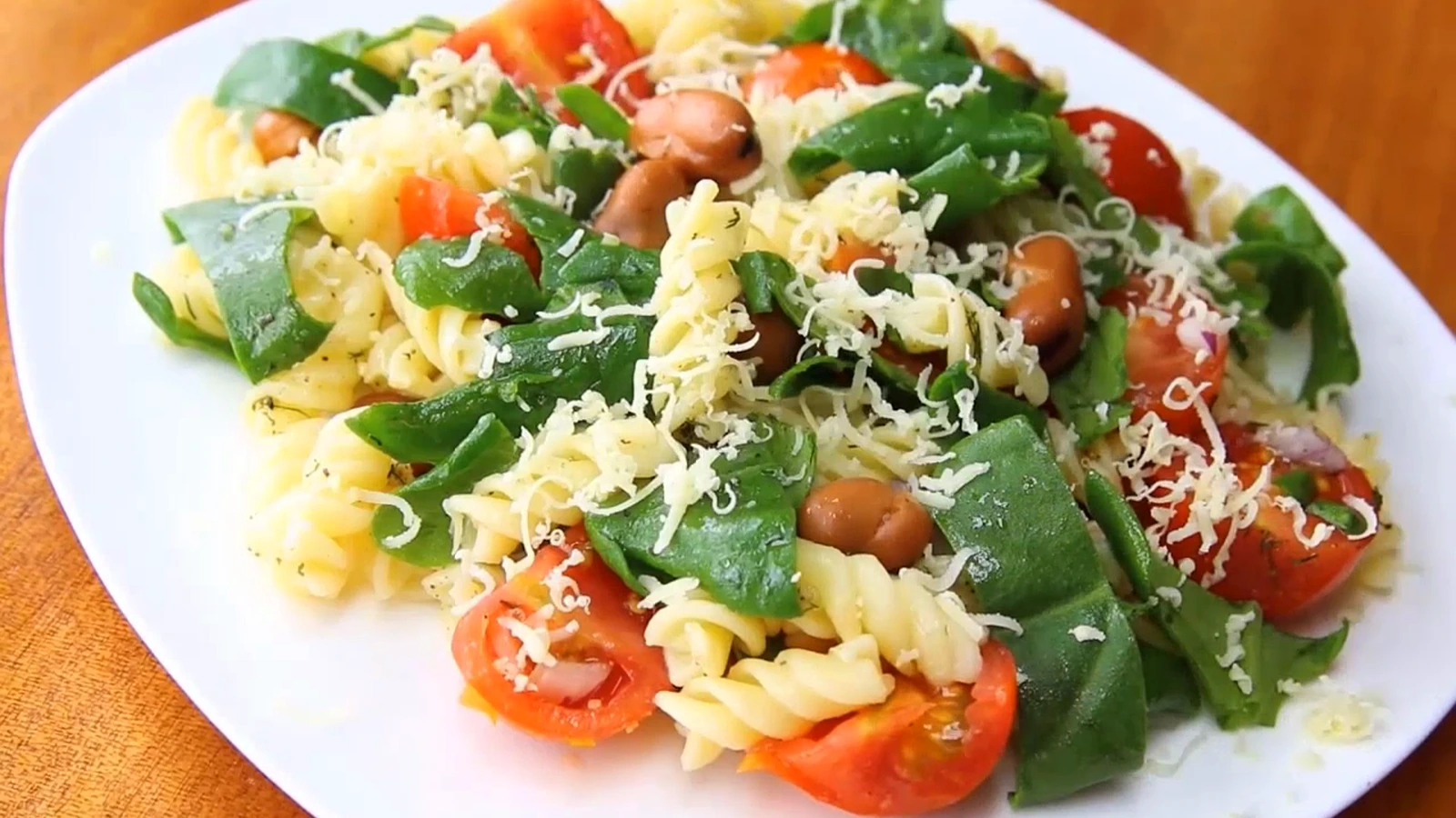 This spinach pasta salad mixes whole wheat fusilli, tomatoes, onion, edamame, and a quick herb dressing into one easy meal bowl.