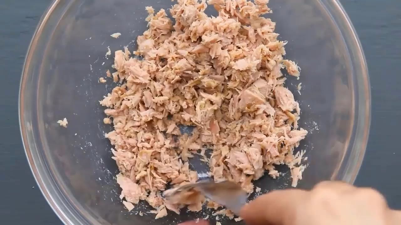 1) Add the drained tuna to a large bowl and break it up with a spoon.