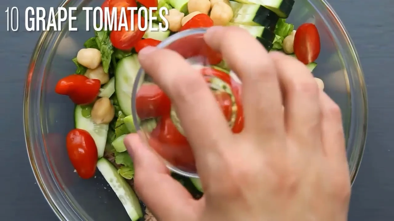 2) Add the romaine, cucumber, scallions, chickpeas, and grape tomatoes to the bowl.