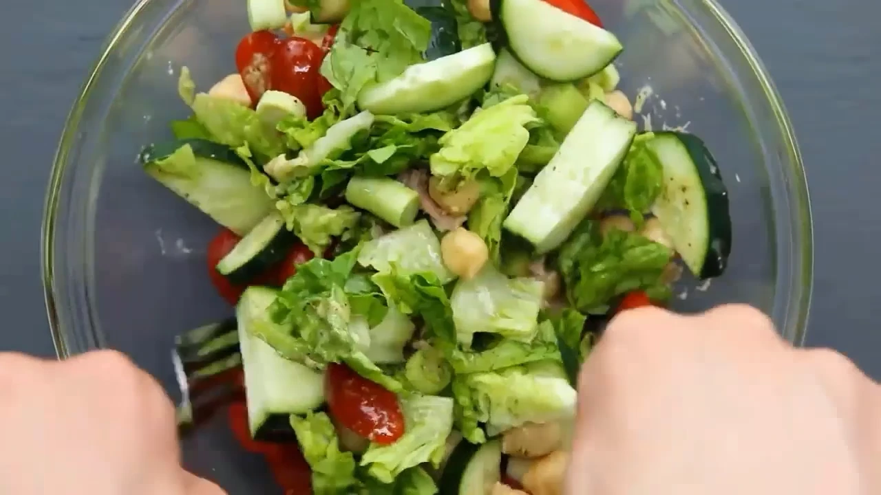 2) Keep the cucumber pieces close in size to what you see in the video for an easier toss.
