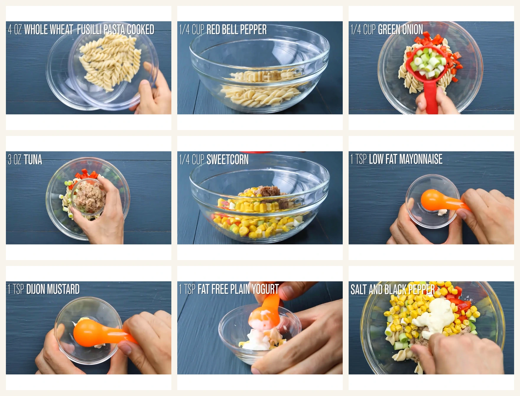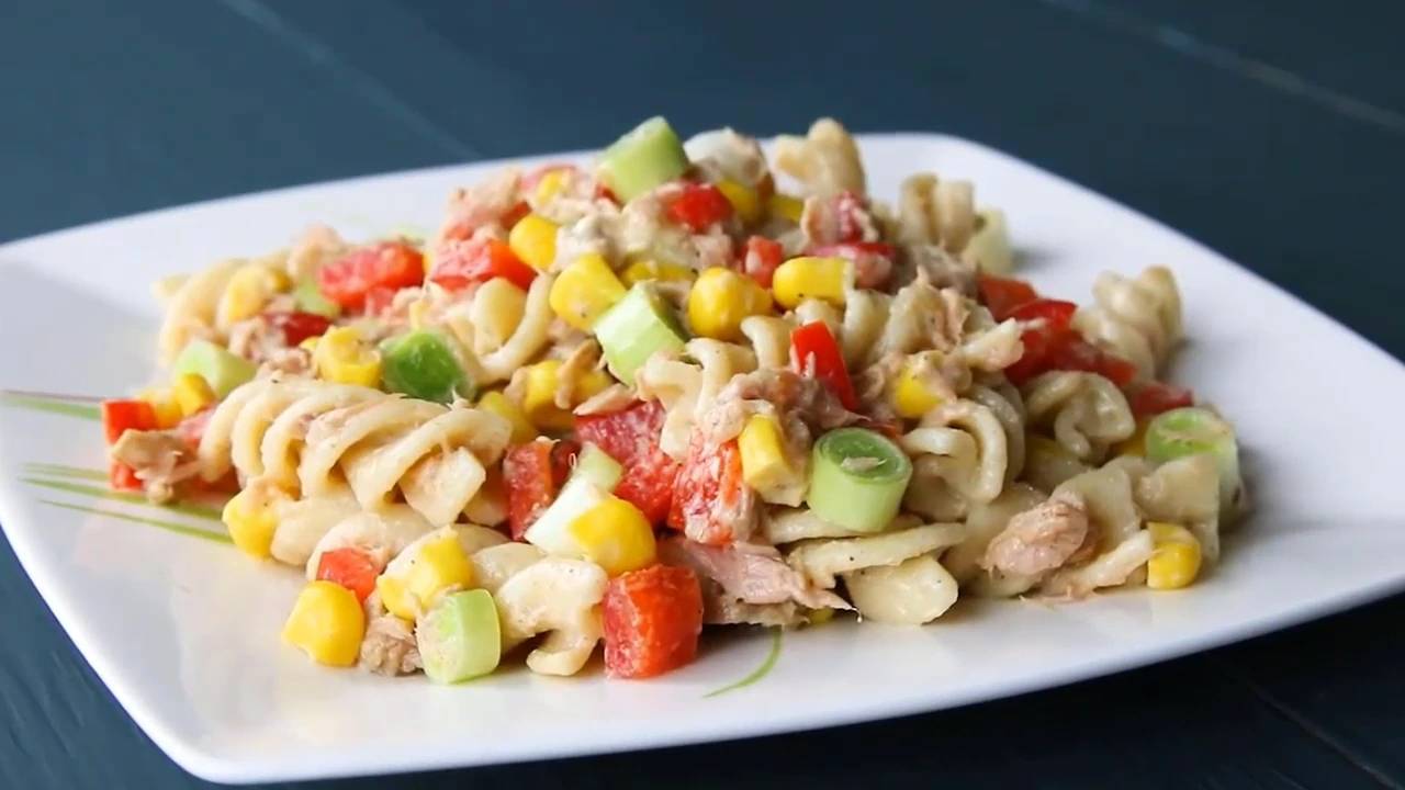 This tuna pasta salad mixes whole-wheat fusilli, vegetables, tuna, and a light, creamy dressing for an easy lunch you can make quickly.