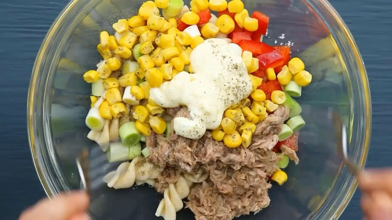 2. Add the red bell pepper, green onion, tuna, and sweetcorn.