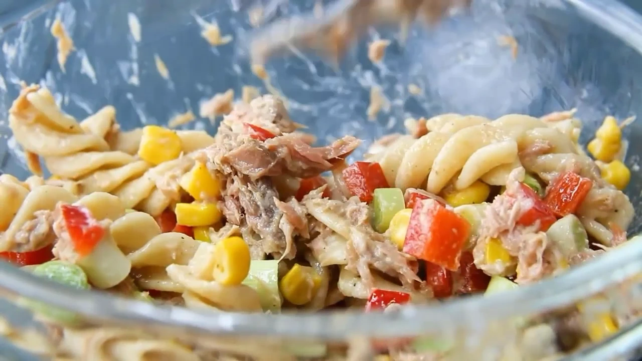 9. Toss everything together until the pasta, tuna, and vegetables all look evenly coated.