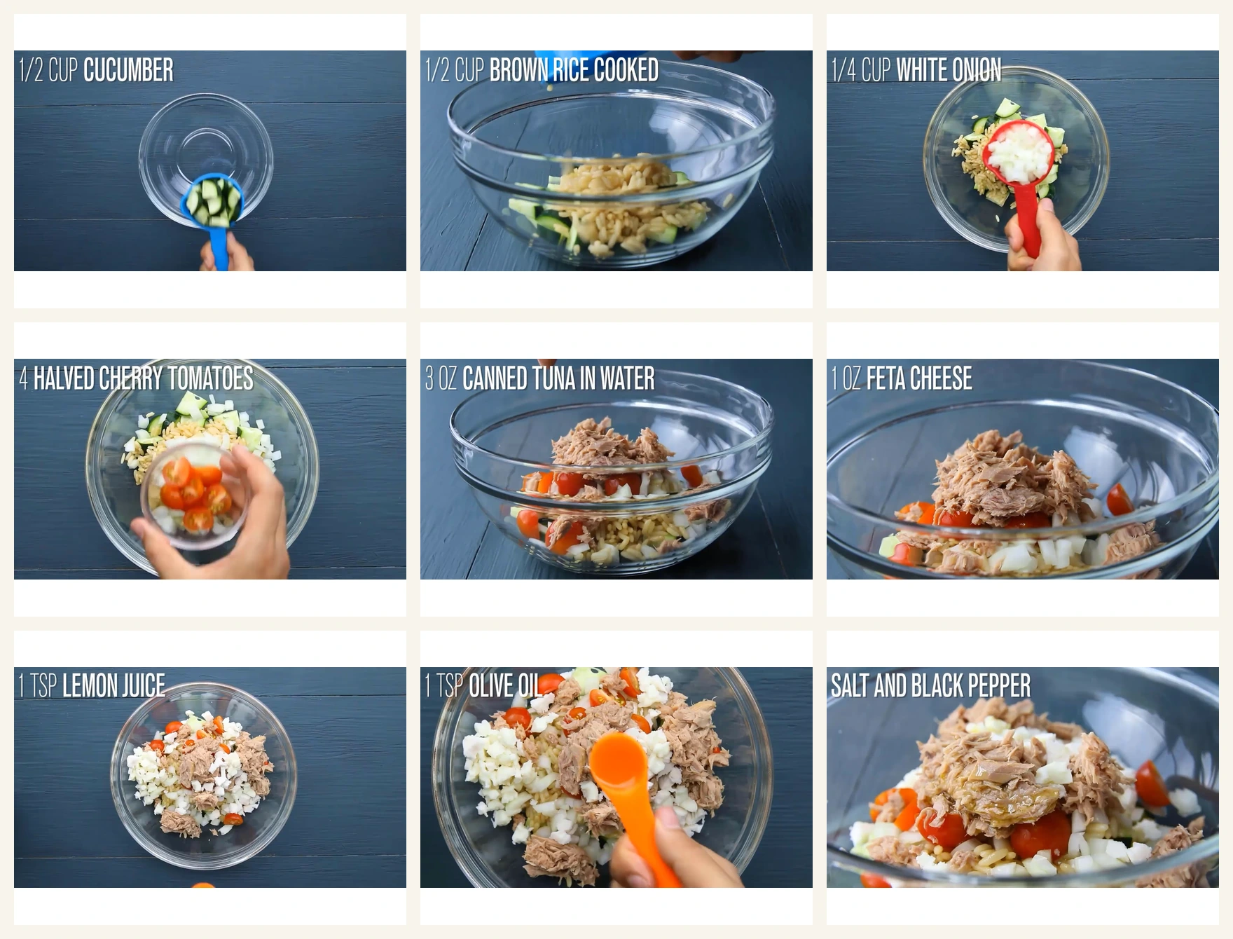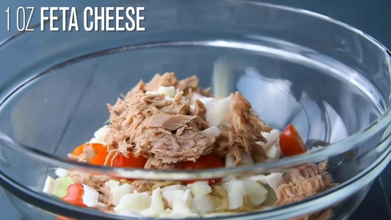 - Add the cucumber, cooked brown rice, white onion, cherry tomatoes, tuna, and feta to a bowl.