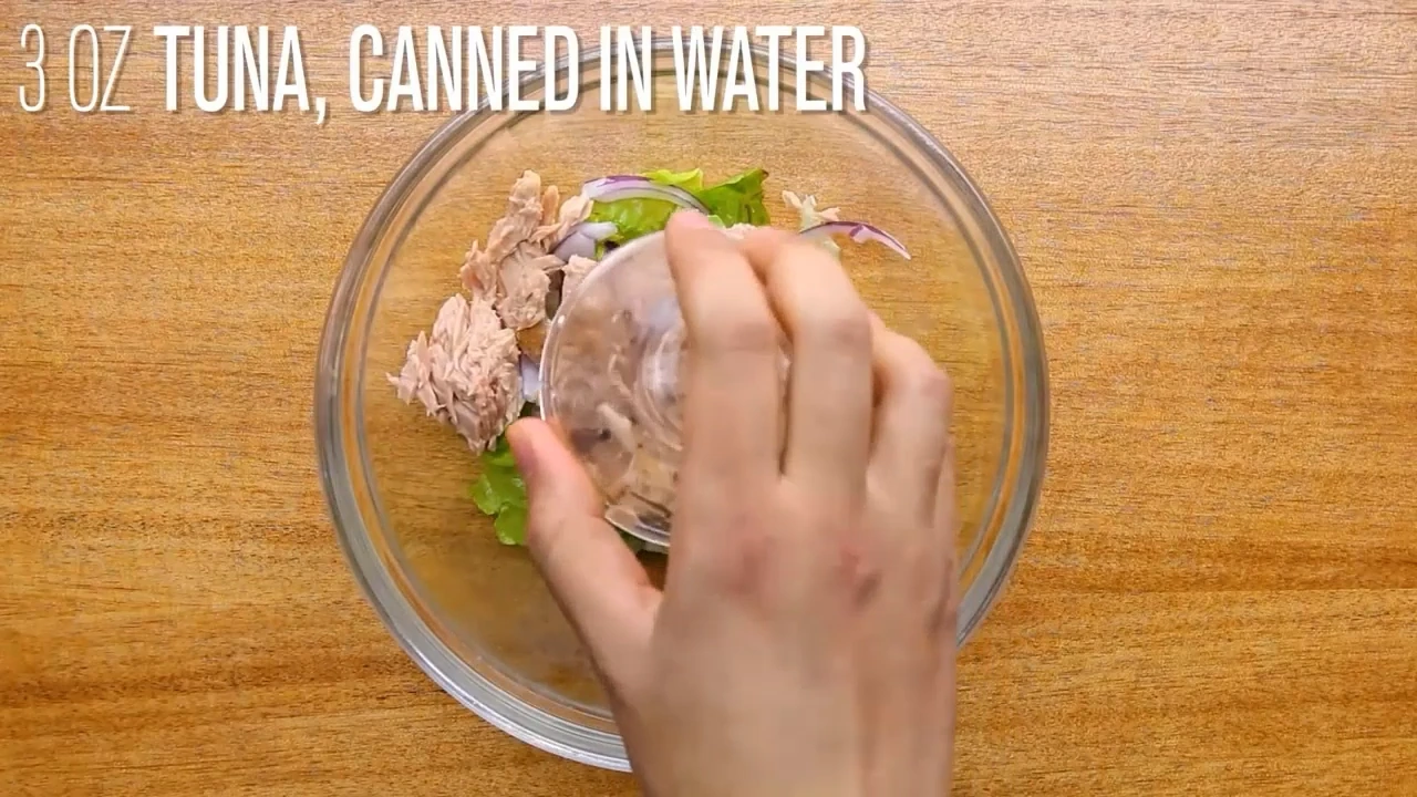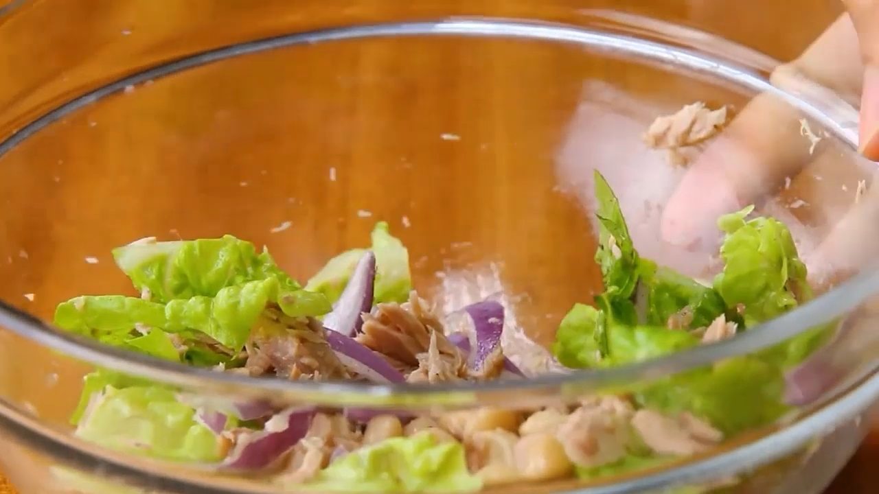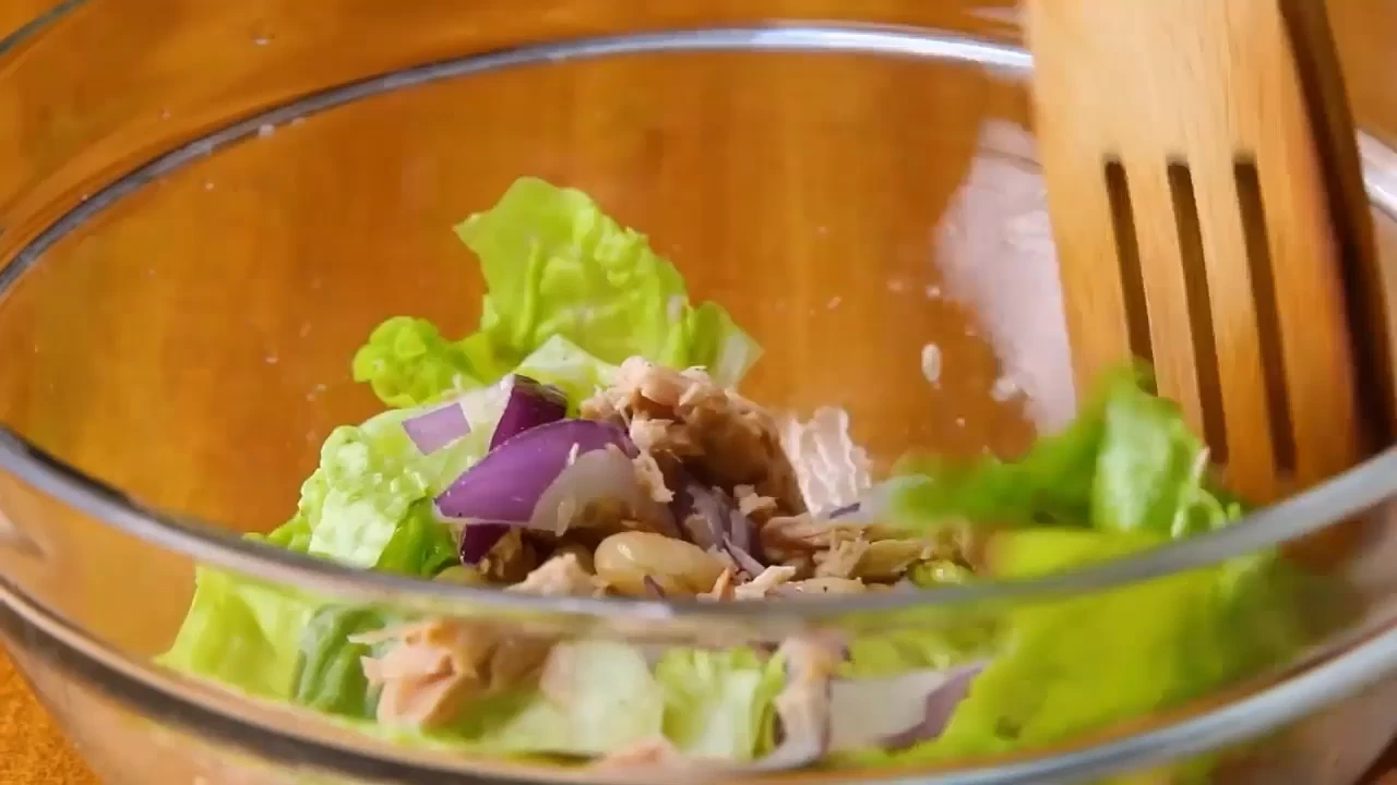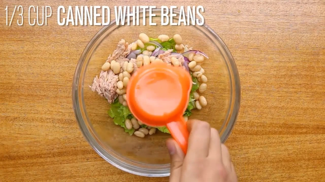 1. Add the lettuce, onion, tuna, and white beans to a bowl.